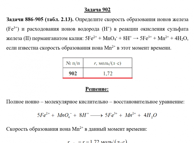 Задачи 886-905 (табл. 2.13). Определите скорость образования ионов железа (Fe3+) и расходования ионов водорода (H+) в реакции окисления сульфата железа (II) перманганатом калия: 5Fe2+ + MnO4- + 8H+ → 5Fe3+ + Mn2+ + 4H2O, если известна скорость образования иона Mn2+ в этот момент времени.