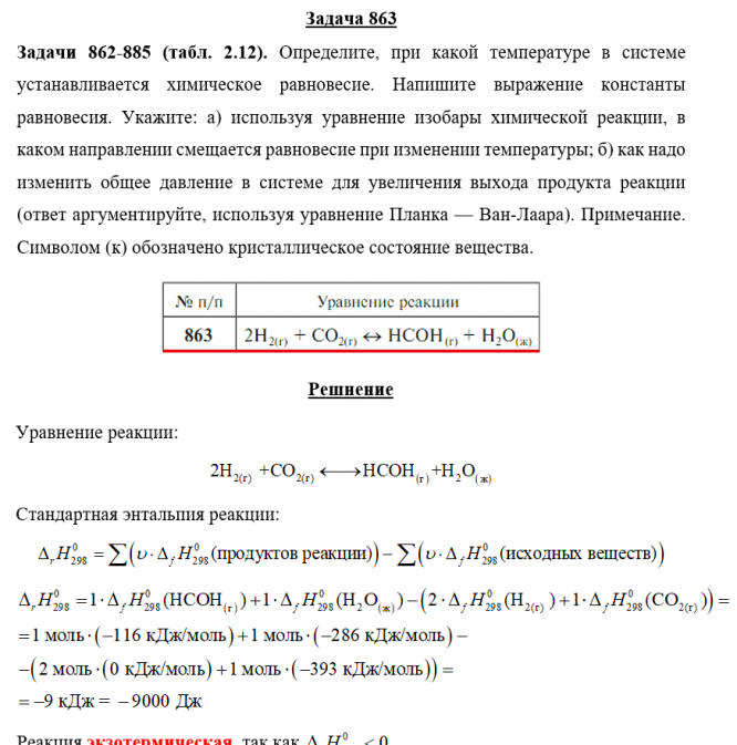Задачи 862-885 (табл. 2.12). Определите, при какой температуре в системе устанавливается химическое равновесие. Напишите выражение константы равновесия. Укажите: а) используя уравнение изобары химической реакции, в каком направлении смещается равновесие при изменении температуры; б) как надо изменить общее давление в системе для увеличения выхода продукта реакции (ответ аргументируйте, используя уравнение Планка — Ван-Лаара). Примечание. Символом (к) обозначено кристаллическое состояние вещества..