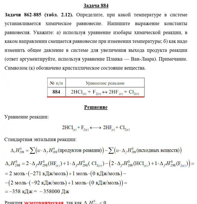 Задача 884 - Определите, при какой температуре в системе устанавливается химическое равновесие. Напишите выражение константы равновесия. Укажите: а) используя уравнение изобары химической реакции, в каком направлении смещается равновесие при изменени