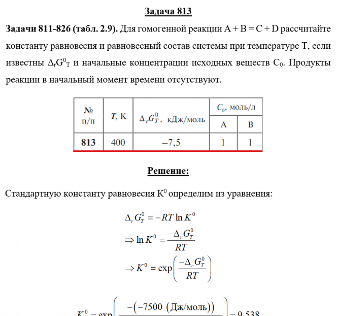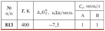 Задача 813 - Для гомогенной реакции А + В = С + D рассчитайте константу равновесия и равновесный состав системы при температуре Т, если известны ΔrG0T и начальные концентрации исходных веществ С0. Продукты реакции в начальный момент времени отсутству