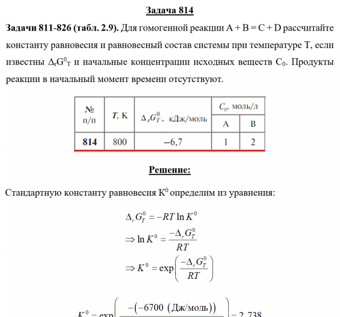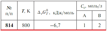 Задача 814 - Для гомогенной реакции А + В = С + D рассчитайте константу равновесия и равновесный состав системы при температуре Т, если известны ΔrG0T и начальные концентрации исходных веществ С0. Продукты реакции в начальный момент времени отсутству