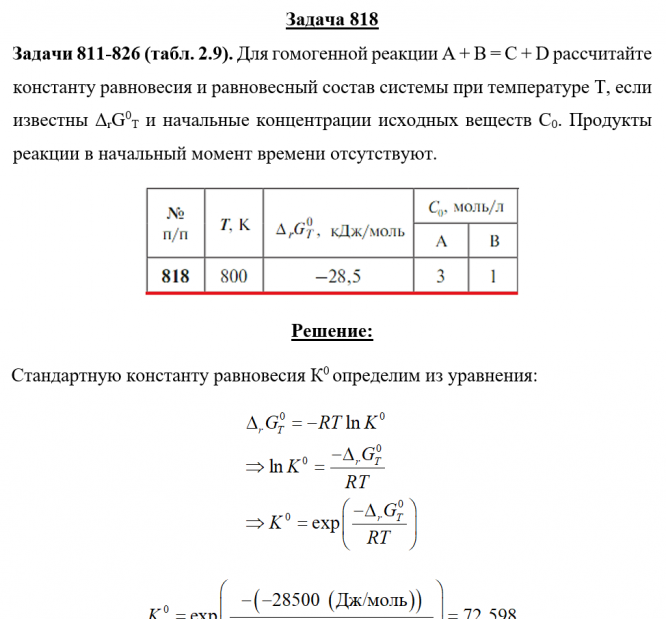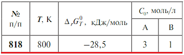 Задача 818 - Для гомогенной реакции А + В = С + D рассчитайте константу равновесия и равновесный состав системы при температуре Т, если известны ΔrG0T и начальные концентрации исходных веществ С0. Продукты реакции в начальный момент времени отсутству