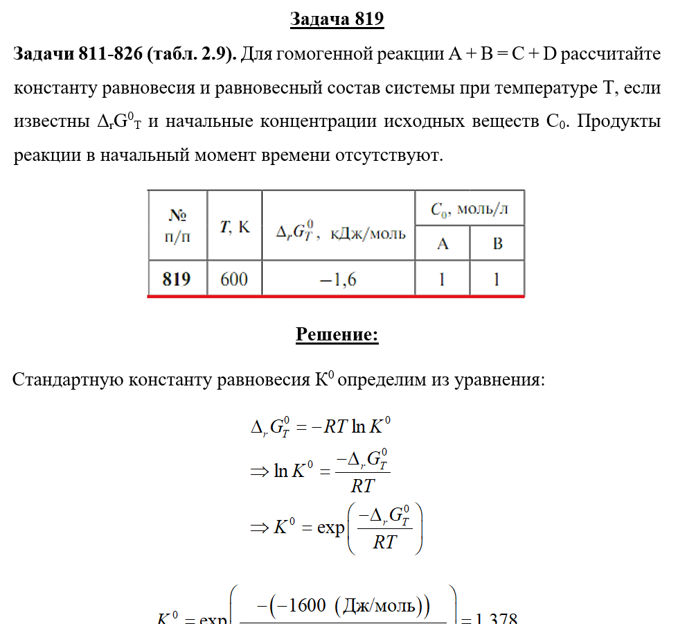 Задача 819 - Для гомогенной реакции А + В = С + D рассчитайте константу равновесия и равновесный состав системы при температуре Т, если известны ΔrG0T и начальные концентрации исходных веществ С0. Продукты реакции в начальный момент времени отсутству