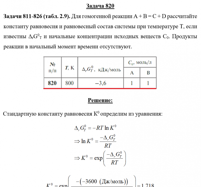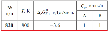 Задача 820 - Для гомогенной реакции А + В = С + D рассчитайте константу равновесия и равновесный состав системы при температуре Т, если известны ΔrG0T и начальные концентрации исходных веществ С0. Продукты реакции в начальный момент времени отсутству