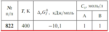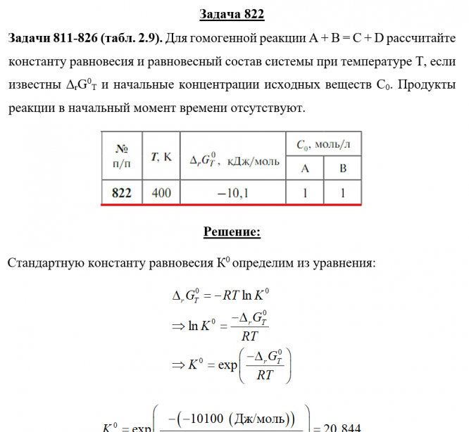 Задача 822 - Для гомогенной реакции А + В = С + D рассчитайте константу равновесия и равновесный состав системы при температуре Т, если известны ΔrG0T и начальные концентрации исходных веществ С0. Продукты реакции в начальный момент времени отсутству