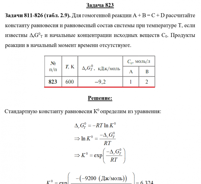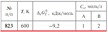 Задача 823 - Для гомогенной реакции А + В = С + D рассчитайте константу равновесия и равновесный состав системы при температуре Т, если известны ΔrG0T и начальные концентрации исходных веществ С0. Продукты реакции в начальный момент времени отсутству