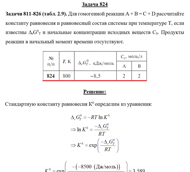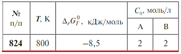 Задача 824 - Для гомогенной реакции А + В = С + D рассчитайте константу равновесия и равновесный состав системы при температуре Т, если известны ΔrG0T и начальные концентрации исходных веществ С0. Продукты реакции в начальный момент времени отсутству