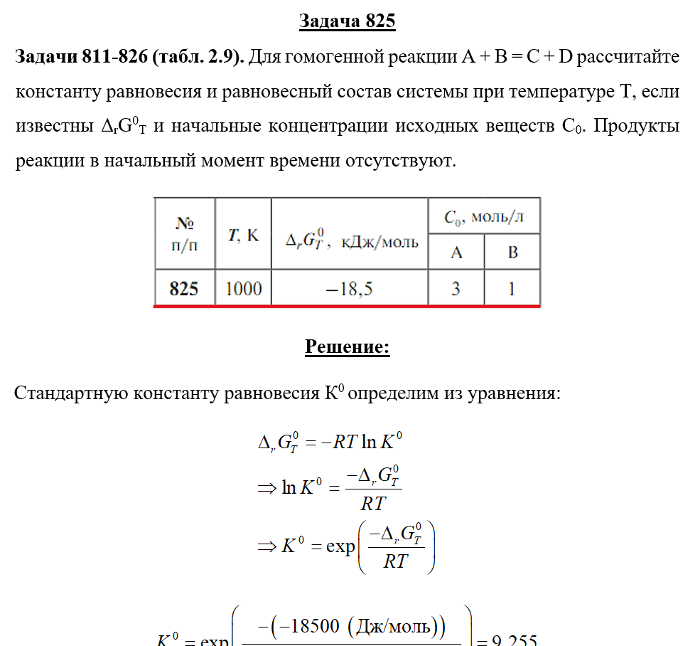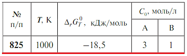 Задача 825 - Для гомогенной реакции А + В = С + D рассчитайте константу равновесия и равновесный состав системы при температуре Т, если известны ΔrG0T и начальные концентрации исходных веществ С0. Продукты реакции в начальный момент времени отсутству