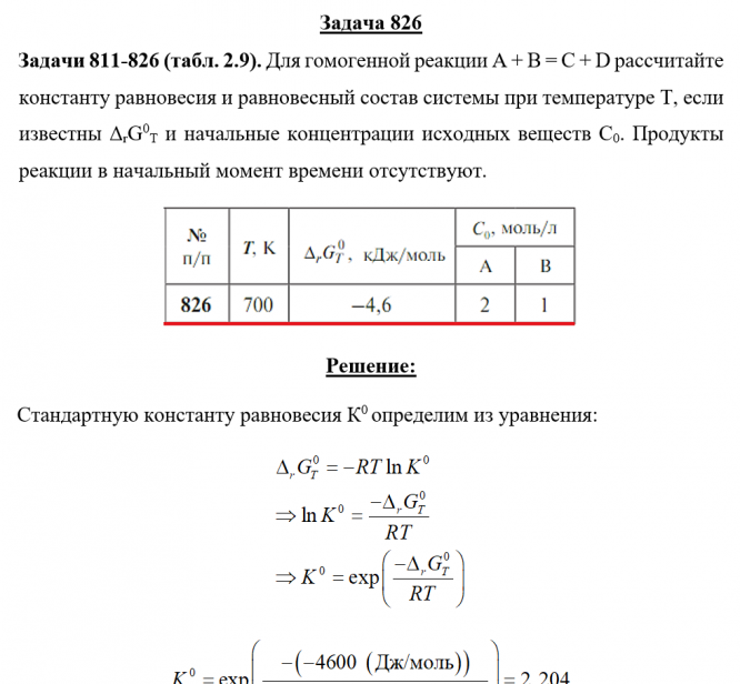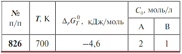 Задача 826 - Для гомогенной реакции А + В = С + D рассчитайте константу равновесия и равновесный состав системы при температуре Т, если известны ΔrG0T и начальные концентрации исходных веществ С0. Продукты реакции в начальный момент времени отсутству