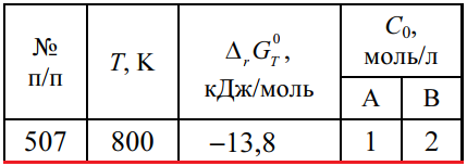 Задача 507 - для гомогенной реакции А + В = С + D рассчитайте константу равновесия и равновесный состав системы при температуре Т, если известны ΔrG0T и начальные концентрации С0 исходных веществ. Продукты реакции в начальный момент времени отсутству