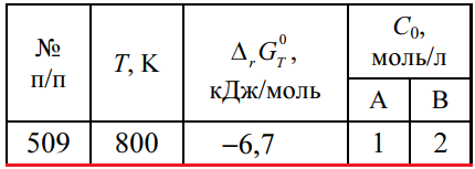 Задача 509 - для гомогенной реакции А + В = С + D рассчитайте константу равновесия и равновесный состав системы при температуре Т, если известны ΔrG0T и начальные концентрации С0 исходных веществ. Продукты реакции в начальный момент времени отсутству