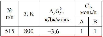 Задача 515 - для гомогенной реакции А + В = С + D рассчитайте константу равновесия и равновесный состав системы при температуре Т, если известны ΔrG0T и начальные концентрации С0 исходных веществ. Продукты реакции в начальный момент времени отсутству