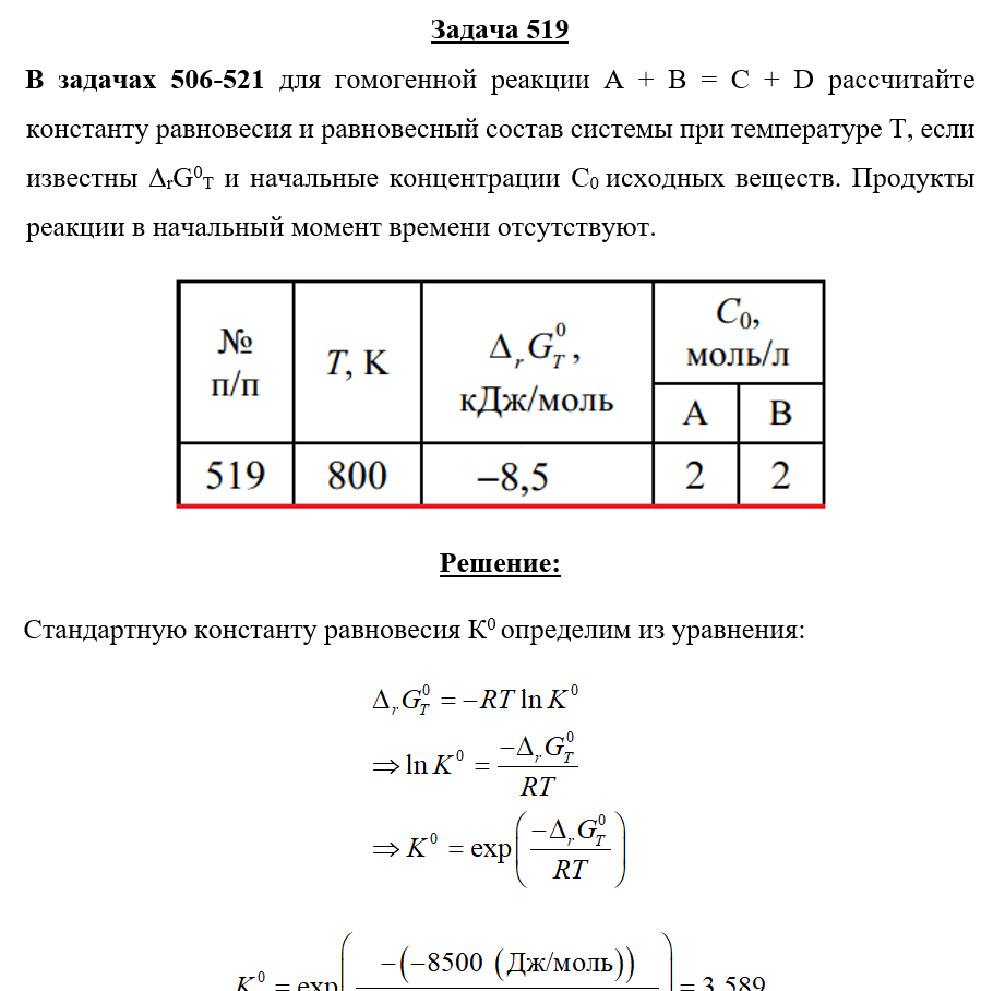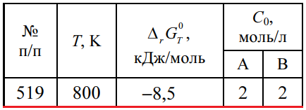 Задача 519 - для гомогенной реакции А + В = С + D рассчитайте константу равновесия и равновесный состав системы при температуре Т, если известны ΔrG0T и начальные концентрации С0 исходных веществ. Продукты реакции в начальный момент времени отсутству