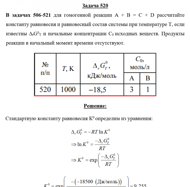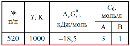 Задача 520 - для гомогенной реакции А + В = С + D рассчитайте константу равновесия и равновесный состав системы при температуре Т, если известны ΔrG0T и начальные концентрации С0 исходных веществ. Продукты реакции в начальный момент времени отсутству