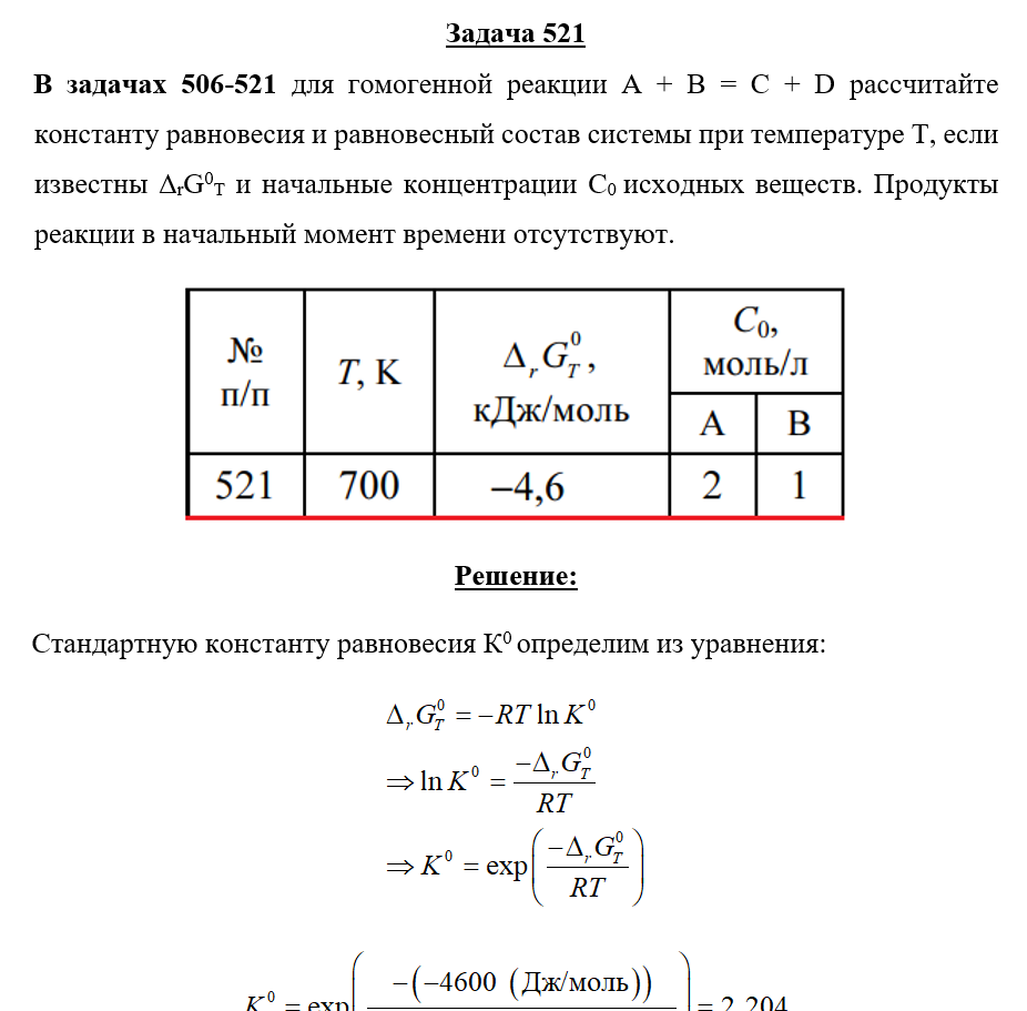 Задача 521 - для гомогенной реакции А + В = С + D рассчитайте константу равновесия и равновесный состав системы при температуре Т, если известны ΔrG0T и начальные концентрации С0 исходных веществ. Продукты реакции в начальный момент времени отсутству