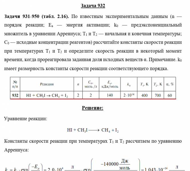 Главная » Учебные материалы » Химия » Решения задач » Несколько классов/семестров » Номер 932 » Задача 932 - По известным экспериментальным данным (n — порядок реакции; Ea — энергия активации; k0 — предэкспоненциальный множитель в уравнении Аррениуса; Т1 и Т2 — начальная и конечная температуры; С0 — исходные концентрации реагентов) рассчитайте