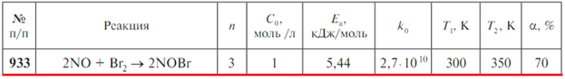 Задачи 931-950 (табл. 2.16). По известным экспериментальным данным (n — порядок реакции; Ea — энергия активации; k0 — предэкспоненциальный множитель в уравнении Аррениуса; Т1 и Т2 — начальная и конечная температуры; С0 — исходные концентрации реагентов) рассчитайте константы скорости реакции при температурах Т1 и Т2 и определите скорость реакции в некоторый момент времени, когда прореагировала заданная доля исходных веществ α. Примечание. k0 имеет размерность константы скорости реакции соответствующего порядка..