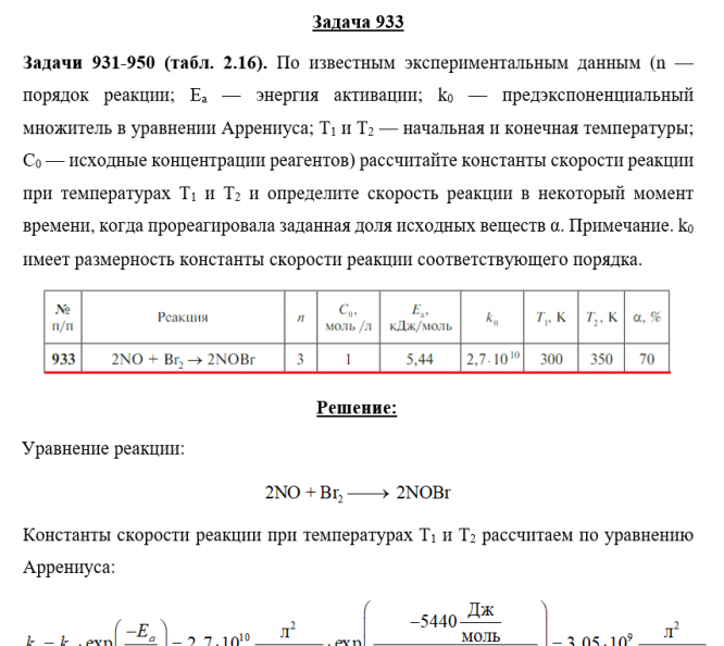 Главная » Учебные материалы » Химия » Решения задач » Несколько классов/семестров » Номер 933 » Задача 933 - По известным экспериментальным данным (n — порядок реакции; Ea — энергия активации; k0 — предэкспоненциальный множитель в уравнении Аррениуса; Т1 и Т2 — начальная и конечная температуры; С0 — исходные концентрации реагентов) рассчитайте