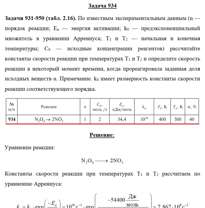 Главная » Учебные материалы » Химия » Решения задач » Несколько классов/семестров » Номер 934 » Задача 934 - По известным экспериментальным данным (n — порядок реакции; Ea — энергия активации; k0 — предэкспоненциальный множитель в уравнении Аррениуса; Т1 и Т2 — начальная и конечная температуры; С0 — исходные концентрации реагентов) рассчитайте