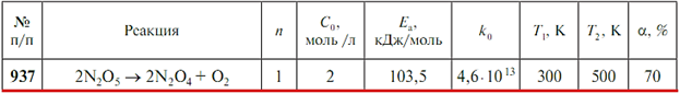 Задача 937 - По известным экспериментальным данным (n — порядок реакции; Ea — энергия активации; k0 — предэкспоненциальный множитель в уравнении Аррениуса; Т1 и Т2 — начальная и конечная температуры; С0 — исходные концентрации реагентов) рассчитайте