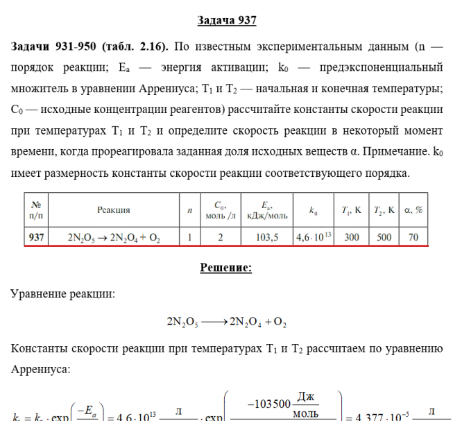 Главная » Учебные материалы » Химия » Решения задач » Несколько классов/семестров » Номер 937 » Задача 937 - По известным экспериментальным данным (n — порядок реакции; Ea — энергия активации; k0 — предэкспоненциальный множитель в уравнении Аррениуса; Т1 и Т2 — начальная и конечная температуры; С0 — исходные концентрации реагентов) рассчитайте