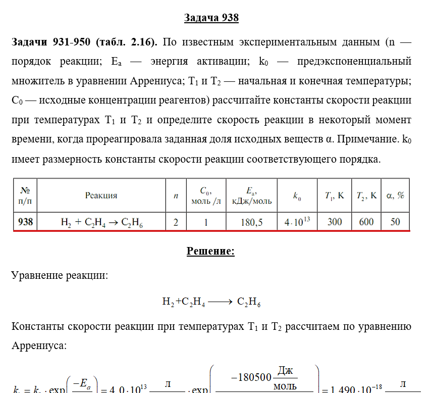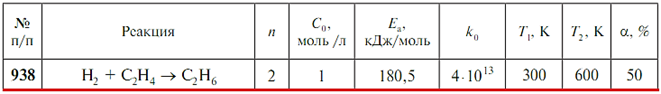 Задача 938 - По известным экспериментальным данным (n — порядок реакции; Ea — энергия активации; k0 — предэкспоненциальный множитель в уравнении Аррениуса; Т1 и Т2 — начальная и конечная температуры; С0 — исходные концентрации реагентов) рассчитайте