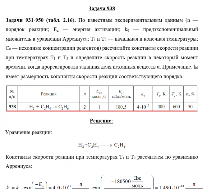 Главная » Учебные материалы » Химия » Решения задач » Несколько классов/семестров » Номер 938 » Задача 938 - По известным экспериментальным данным (n — порядок реакции; Ea — энергия активации; k0 — предэкспоненциальный множитель в уравнении Аррениуса; Т1 и Т2 — начальная и конечная температуры; С0 — исходные концентрации реагентов) рассчитайте