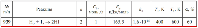 Задача 939 - По известным экспериментальным данным (n — порядок реакции; Ea — энергия активации; k0 — предэкспоненциальный множитель в уравнении Аррениуса; Т1 и Т2 — начальная и конечная температуры; С0 — исходные концентрации реагентов) рассчитайте
