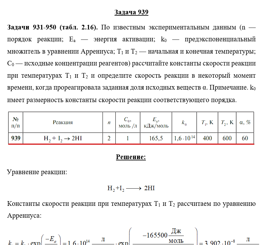 Для студентов по предмету ХимияЗадача 939 - По известным экспериментальным данным (n — порядок реакции; Ea — энергия активации; k0 — предэкспоненциальный множитель в уравнении АрренЗадача 939 - По известным экспериментальным данным (n — порядок реакции; Ea — энергия активации; k0 — предэкспоненциальный множитель в уравнении Аррен