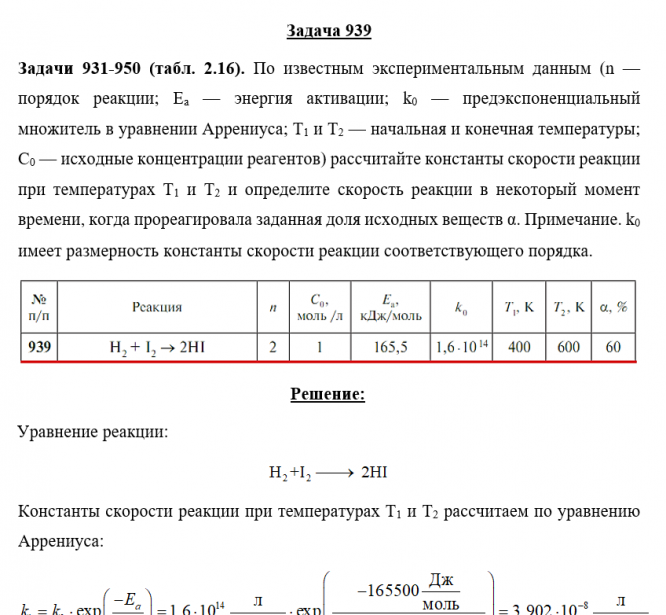 Главная » Учебные материалы » Химия » Решения задач » Несколько классов/семестров » Номер 939 » Задача 939 - По известным экспериментальным данным (n — порядок реакции; Ea — энергия активации; k0 — предэкспоненциальный множитель в уравнении Аррениуса; Т1 и Т2 — начальная и конечная температуры; С0 — исходные концентрации реагентов) рассчитайте