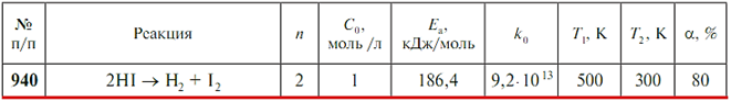 Задачи 931-950 (табл. 2.16). По известным экспериментальным данным (n — порядок реакции; Ea — энергия активации; k0 — предэкспоненциальный множитель в уравнении Аррениуса; Т1 и Т2 — начальная и конечная температуры; С0 — исходные концентрации реагентов) рассчитайте константы скорости реакции при температурах Т1 и Т2 и определите скорость реакции в некоторый момент времени, когда прореагировала заданная доля исходных веществ α. Примечание. k0 имеет размерность константы скорости реакции соответствующего порядка..