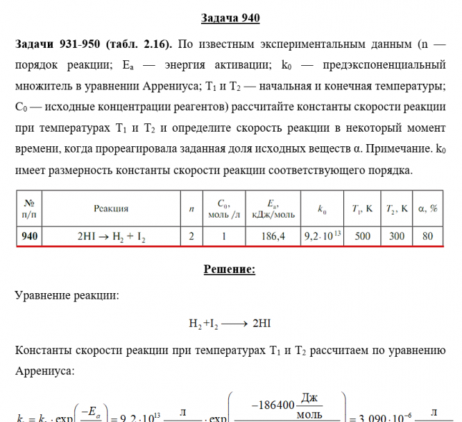 Главная » Учебные материалы » Химия » Решения задач » Несколько классов/семестров » Номер 940 » Задача 940 - По известным экспериментальным данным (n — порядок реакции; Ea — энергия активации; k0 — предэкспоненциальный множитель в уравнении Аррениуса; Т1 и Т2 — начальная и конечная температуры; С0 — исходные концентрации реагентов) рассчитайте
