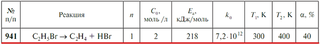 Задача 941 - По известным экспериментальным данным (n — порядок реакции; Ea — энергия активации; k0 — предэкспоненциальный множитель в уравнении Аррениуса; Т1 и Т2 — начальная и конечная температуры; С0 — исходные концентрации реагентов) рассчитайте