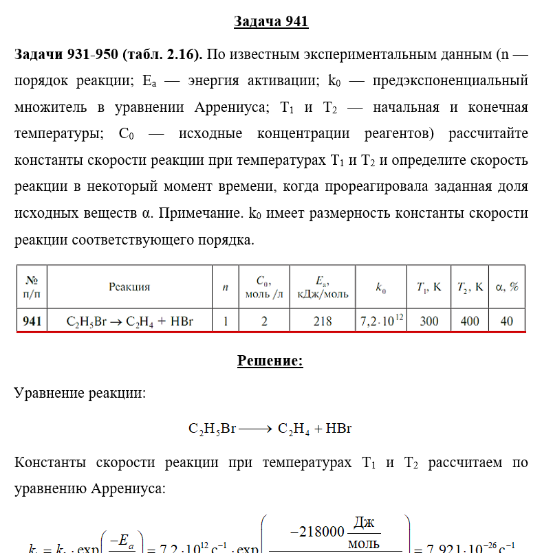 Задачи 931-950 (табл. 2.16). По известным экспериментальным данным (n — порядок реакции; Ea — энергия активации; k0 — предэкспоненциальный множитель в уравнении Аррениуса; Т1 и Т2 — начальная и конечная температуры; С0 — исходные концентрации реагентов) рассчитайте константы скорости реакции при температурах Т1 и Т2 и определите скорость реакции в некоторый момент времени, когда прореагировала заданная доля исходных веществ α. Примечание. k0 имеет размерность константы скорости реакции соответствующего порядка..