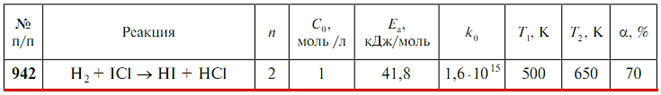 Задача 942 - По известным экспериментальным данным (n — порядок реакции; Ea — энергия активации; k0 — предэкспоненциальный множитель в уравнении Аррениуса; Т1 и Т2 — начальная и конечная температуры; С0 — исходные концентрации реагентов) рассчитайте