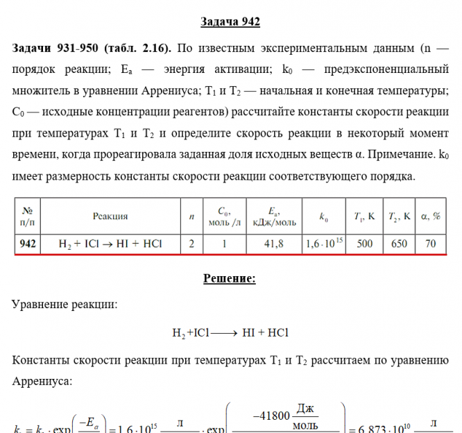 Главная » Учебные материалы » Химия » Решения задач » Несколько классов/семестров » Номер 942 » Задача 942 - По известным экспериментальным данным (n — порядок реакции; Ea — энергия активации; k0 — предэкспоненциальный множитель в уравнении Аррениуса; Т1 и Т2 — начальная и конечная температуры; С0 — исходные концентрации реагентов) рассчитайте