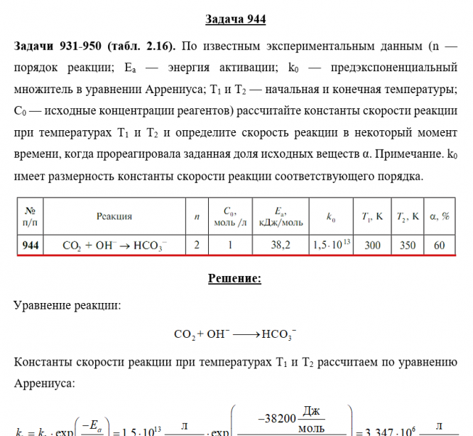Главная » Учебные материалы » Химия » Решения задач » Несколько классов/семестров » Номер 944 » Задача 944 - По известным экспериментальным данным (n — порядок реакции; Ea — энергия активации; k0 — предэкспоненциальный множитель в уравнении Аррениуса; Т1 и Т2 — начальная и конечная температуры; С0 — исходные концентрации реагентов) рассчитайте