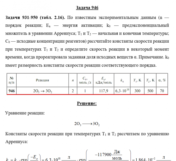 Главная » Учебные материалы » Химия » Решения задач » Несколько классов/семестров » Номер 946 » Задача 946 - По известным экспериментальным данным (n — порядок реакции; Ea — энергия активации; k0 — предэкспоненциальный множитель в уравнении Аррениуса; Т1 и Т2 — начальная и конечная температуры; С0 — исходные концентрации реагентов) рассчитайте