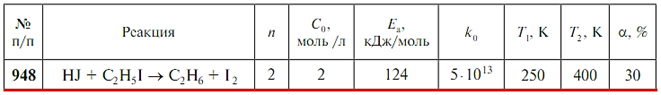Задача 614 - по известным экспериментальным данным (n — порядок реакции; Ea — энергия активации; k0 — предэкспоненциальный множитель в уравнении Аррениуса (имеет размерность скорости соответствующего порядка); Т1 и Т2 — начальная и конечная температу