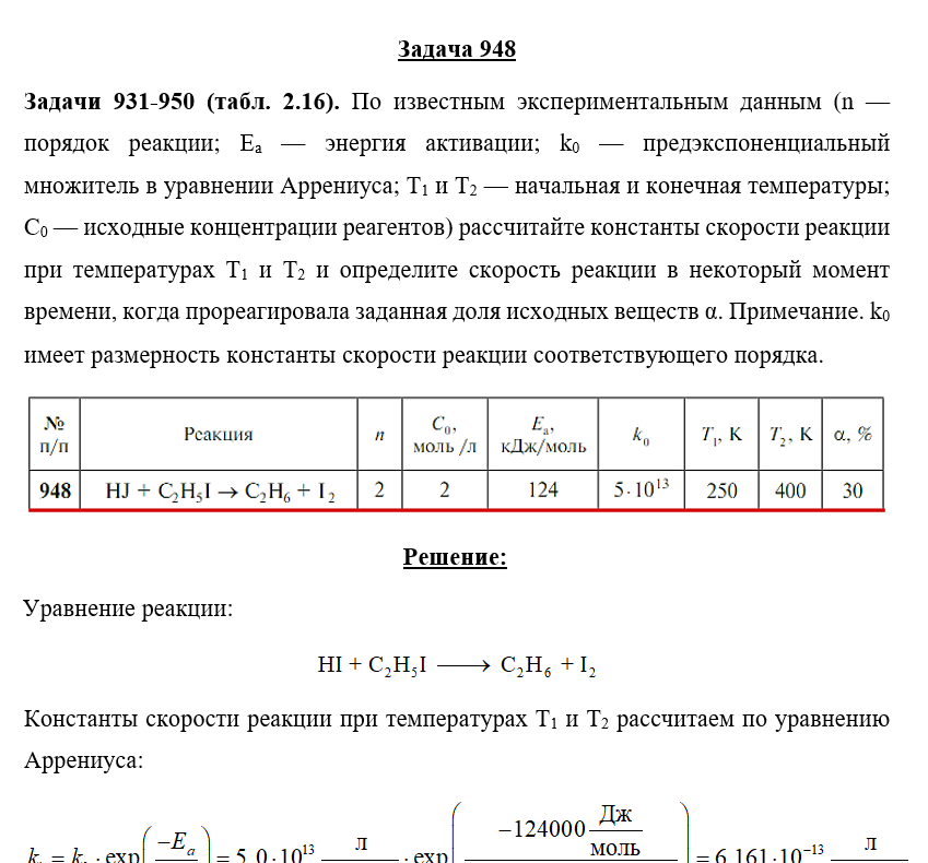 Для студентов по предмету ХимияЗадача 948 - По известным экспериментальным данным (n — порядок реакции; Ea — энергия активации; k0 — предэкспоненциальный множитель в уравнении АрренЗадача 948 - По известным экспериментальным данным (n — порядок реакции; Ea — энергия активации; k0 — предэкспоненциальный множитель в уравнении Аррен