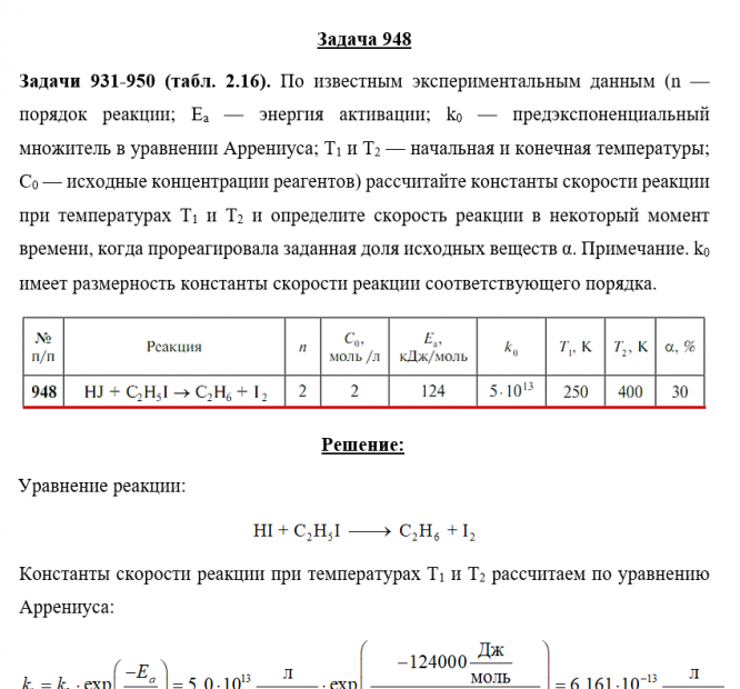 Главная » Учебные материалы » Химия » Решения задач » Несколько классов/семестров » Номер 948 » Задача 948 - По известным экспериментальным данным (n — порядок реакции; Ea — энергия активации; k0 — предэкспоненциальный множитель в уравнении Аррениуса; Т1 и Т2 — начальная и конечная температуры; С0 — исходные концентрации реагентов) рассчитайте