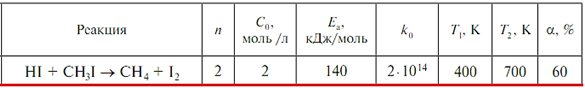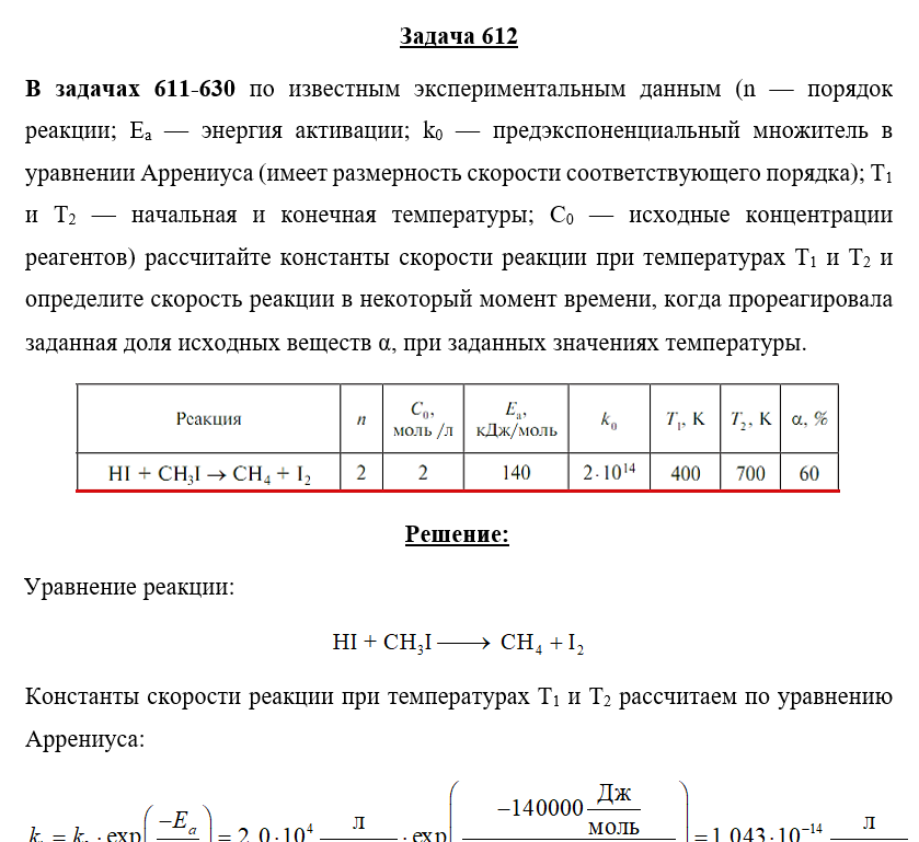 Задача 612 - по известным экспериментальным данным (n — порядок реакции; Ea — энергия активации; k0 — предэкспоненциальный множитель в уравнении Аррениуса (имеет размерность скорости соответствующего порядка); Т1 и Т2 — начальная и конечная температу