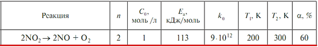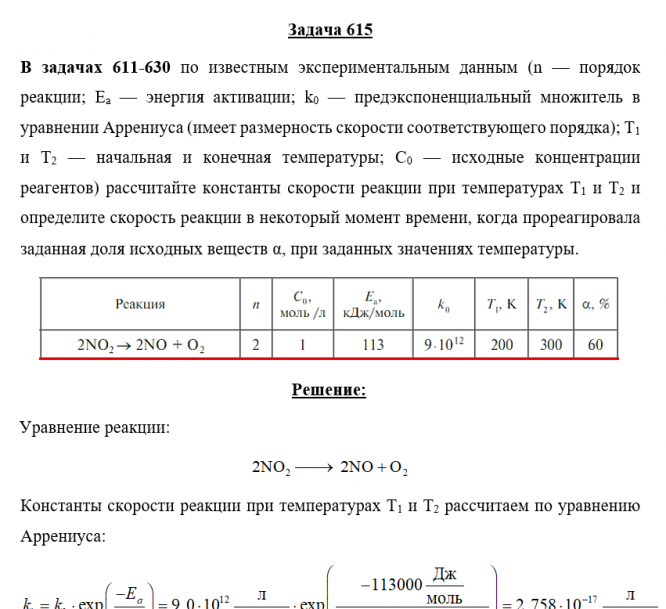 Задача 615 - по известным экспериментальным данным (n — порядок реакции; Ea — энергия активации; k0 — предэкспоненциальный множитель в уравнении Аррениуса (имеет размерность скорости соответствующего порядка); Т1 и Т2 — начальная и конечная температу