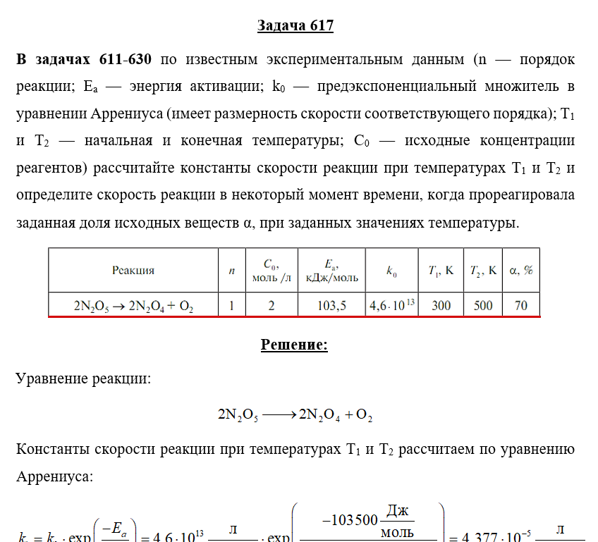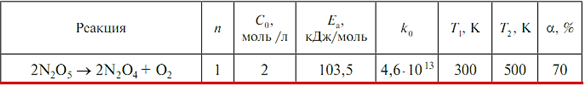 Задача 617 - по известным экспериментальным данным (n — порядок реакции; Ea — энергия активации; k0 — предэкспоненциальный множитель в уравнении Аррениуса (имеет размерность скорости соответствующего порядка); Т1 и Т2 — начальная и конечная температу