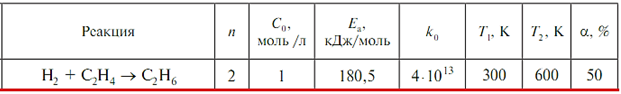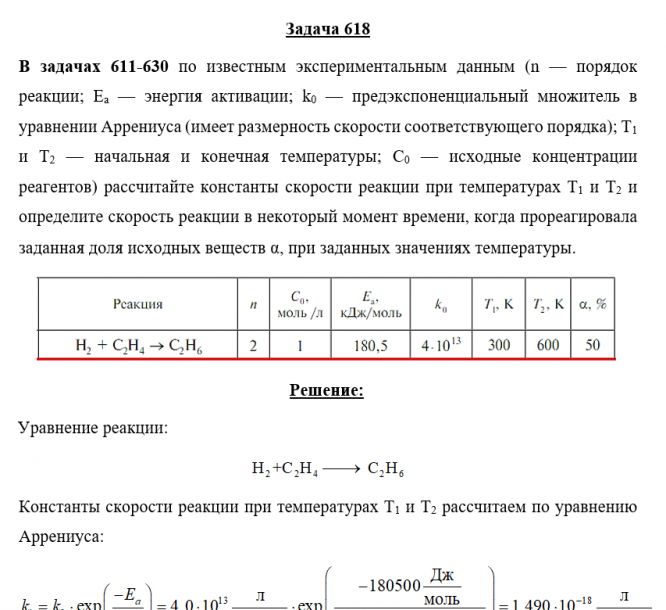 Задача 618 - по известным экспериментальным данным (n — порядок реакции; Ea — энергия активации; k0 — предэкспоненциальный множитель в уравнении Аррениуса (имеет размерность скорости соответствующего порядка); Т1 и Т2 — начальная и конечная температу