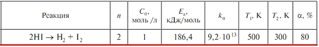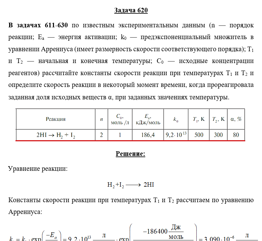 Задача 620 - по известным экспериментальным данным (n — порядок реакции; Ea — энергия активации; k0 — предэкспоненциальный множитель в уравнении Аррениуса (имеет размерность скорости соответствующего порядка); Т1 и Т2 — начальная и конечная температу