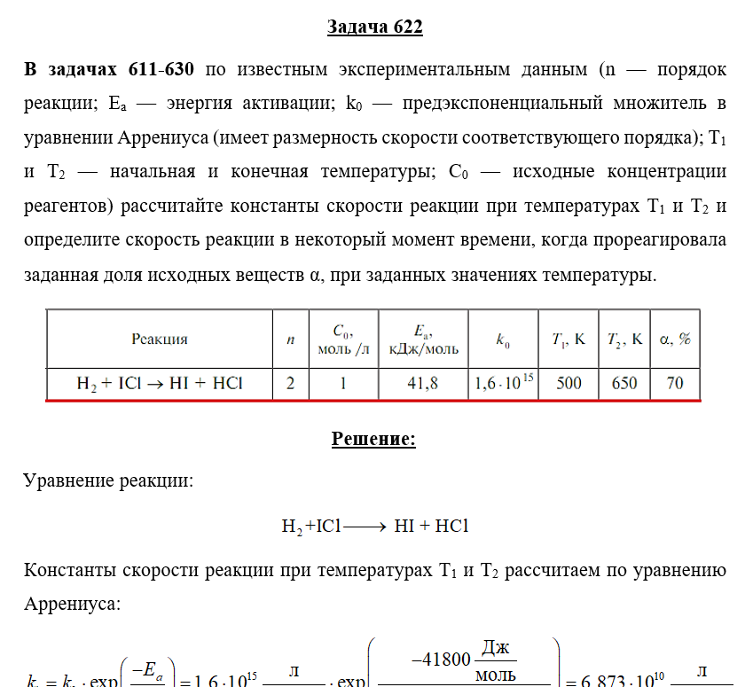 Задача 622- по известным экспериментальным данным (n — порядок реакции; Ea — энергия активации; k0 — предэкспоненциальный множитель в уравнении Аррениуса (имеет размерность скорости соответствующего порядка); Т1 и Т2 — начальная и конечная температу