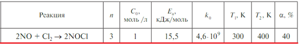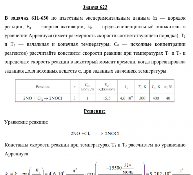 Задача 623 - по известным экспериментальным данным (n — порядок реакции; Ea — энергия активации; k0 — предэкспоненциальный множитель в уравнении Аррениуса (имеет размерность скорости соответствующего порядка); Т1 и Т2 — начальная и конечная температу
