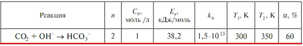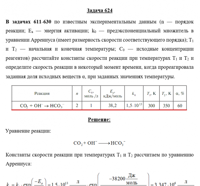 Задача 624 - по известным экспериментальным данным (n — порядок реакции; Ea — энергия активации; k0 — предэкспоненциальный множитель в уравнении Аррениуса (имеет размерность скорости соответствующего порядка); Т1 и Т2 — начальная и конечная температу
