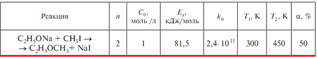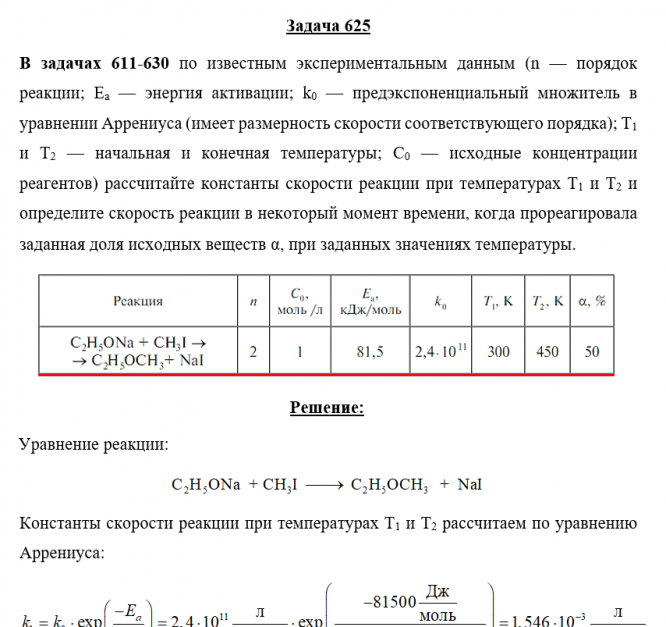 Задача 625 - по известным экспериментальным данным (n — порядок реакции; Ea — энергия активации; k0 — предэкспоненциальный множитель в уравнении Аррениуса (имеет размерность скорости соответствующего порядка); Т1 и Т2 — начальная и конечная температу